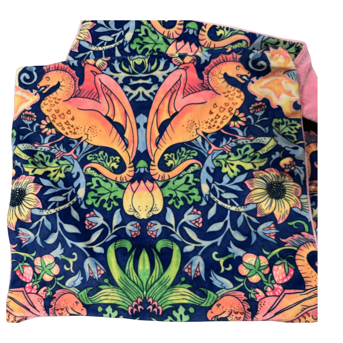 Throw pillows are 18”x18” Minky pillows, handmade by me. They have a printed side and a solid side. The cover is removeable via zipper or foldover, and they do come with the pillow insert.