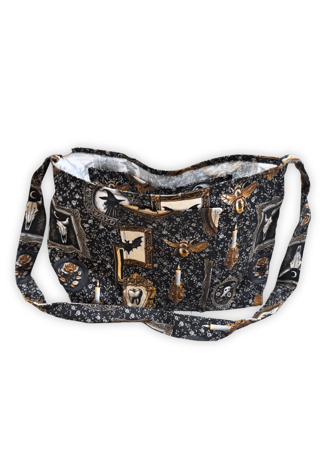 Tote bags are cotton canvas, handmade by me. They measure 13x18” with 32” long straps, and come standard with interior and exterior pockets!